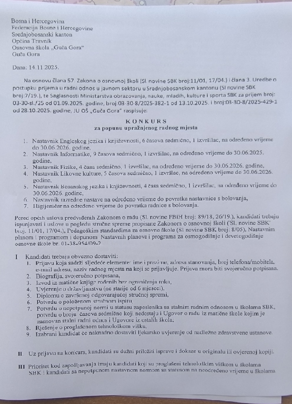 Na osnovu člana 57. Zakona o osnovnoj školi (Sl. novine SBK broj:11/01, 17/04), člana 3. Uredbe o postupku prijema u radni odnos u javnom sektoru u Srednjobosanskom kantonu (Sl novine SBK broj:7/19) i Saglasnosti za prijem Ministarstva obrazovanja, nauke, mladih, kulture i sporta SBK broj: 03-30-1/2024-274 od 26.09.2024 godine, te člana 4. Pravilnika o postupku prijema u radni odnos u Osnovnoj školi „Guča Gora“, JU OŠ „Guča Gora“ raspisuje:
